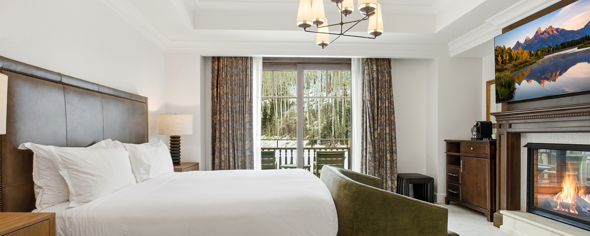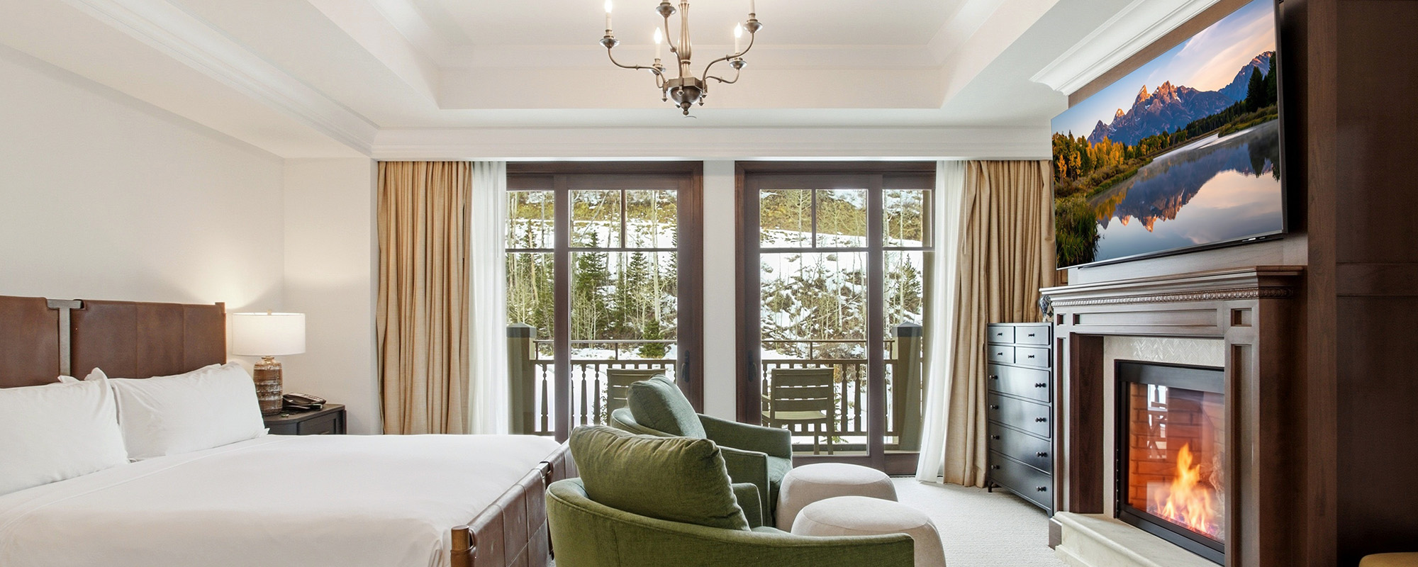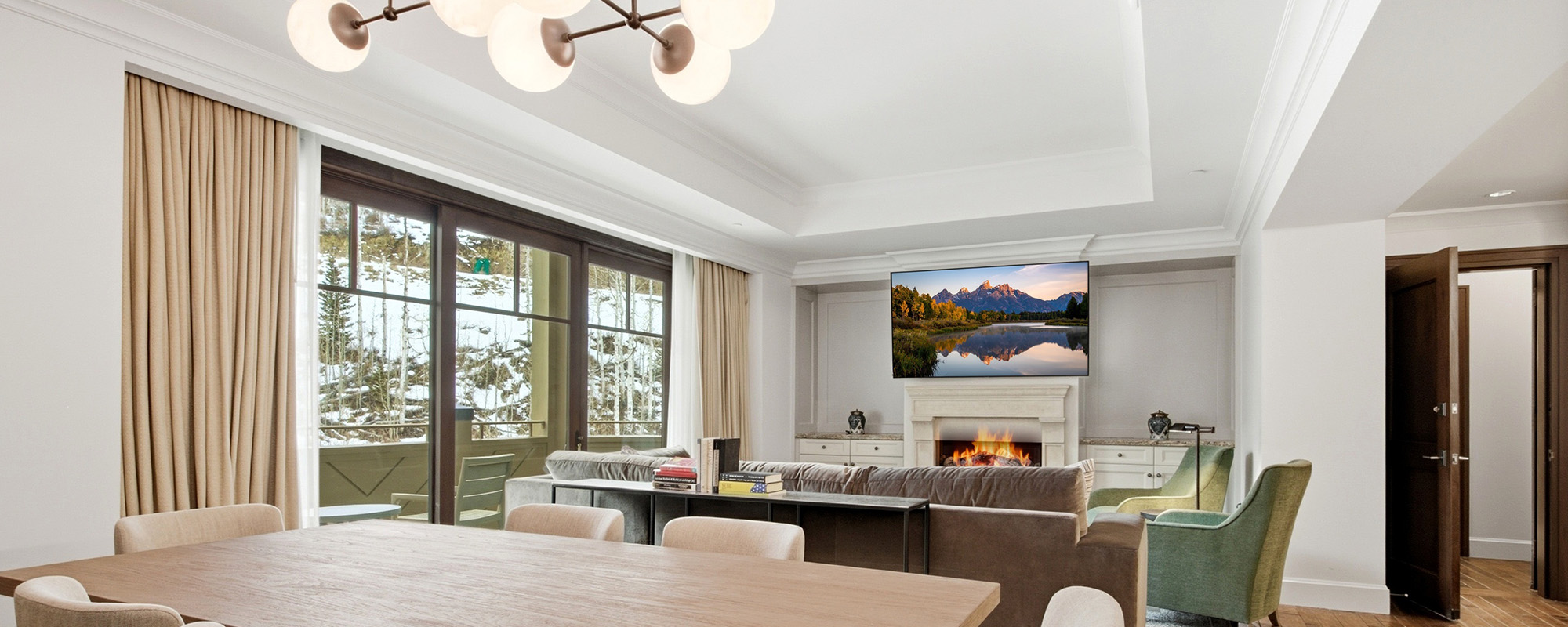 - Living area features a fireplace, built-in cabinetry and floor-to-ceiling glass doors opening out to a balcony with expansive mountain views