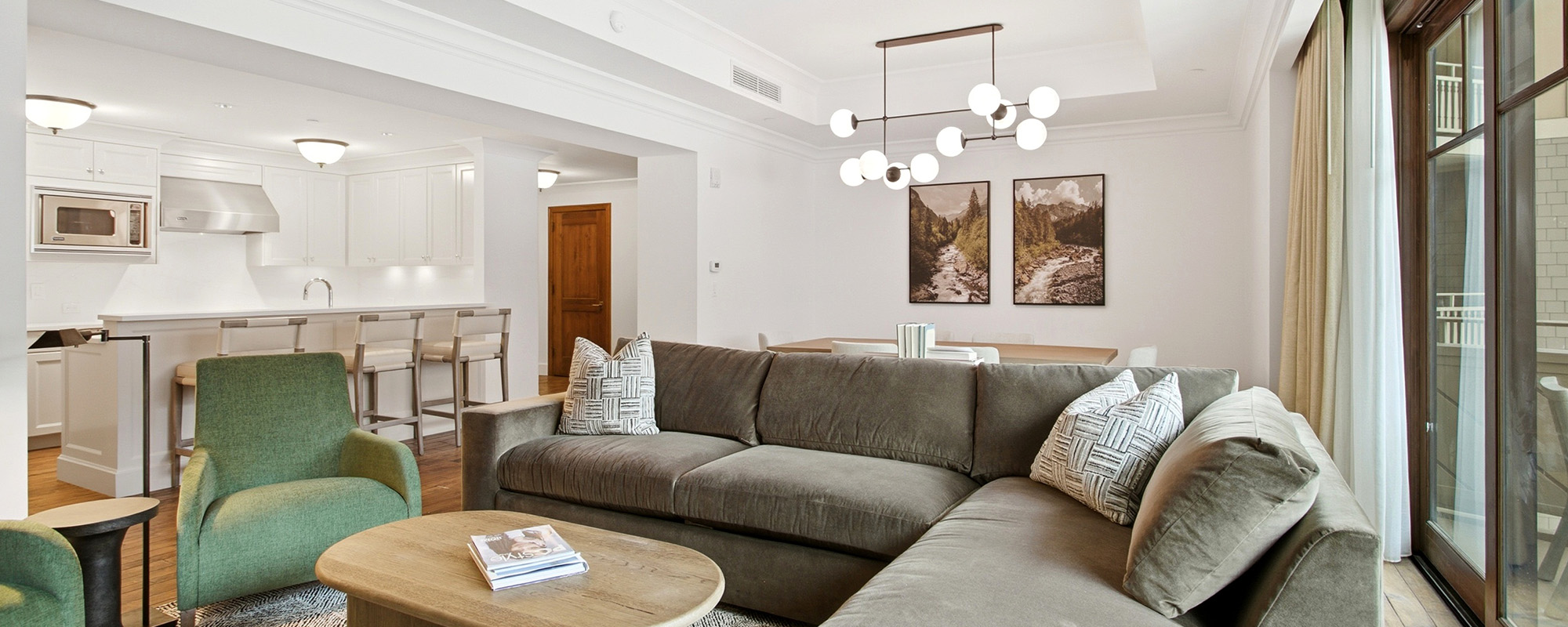 - Open-concept floor plan with with ski run views from living area and each of the three bedrooms